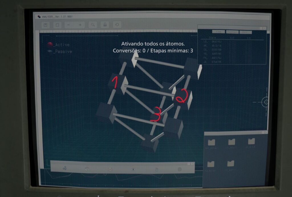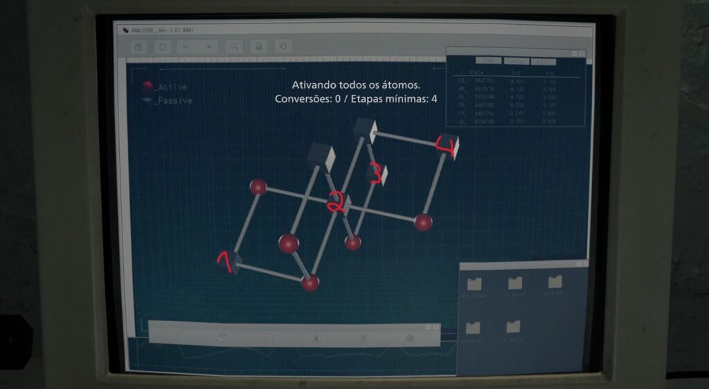 A amostra de sangue convergida, é a amostra de cor verde. Você pode encontrá-la na Sala de Espera, no ARMÁRIO (esta sala é aberta com pulseira), e no modo insano ela esta na Sala de Registros. Ela contém sangue de mutação e pode ser usada para criar injetores vitais e munição 12,7 x 55 mm. Selecione os átomos quadrados (passivos) como na imagem abaixo, para ativá-los.
